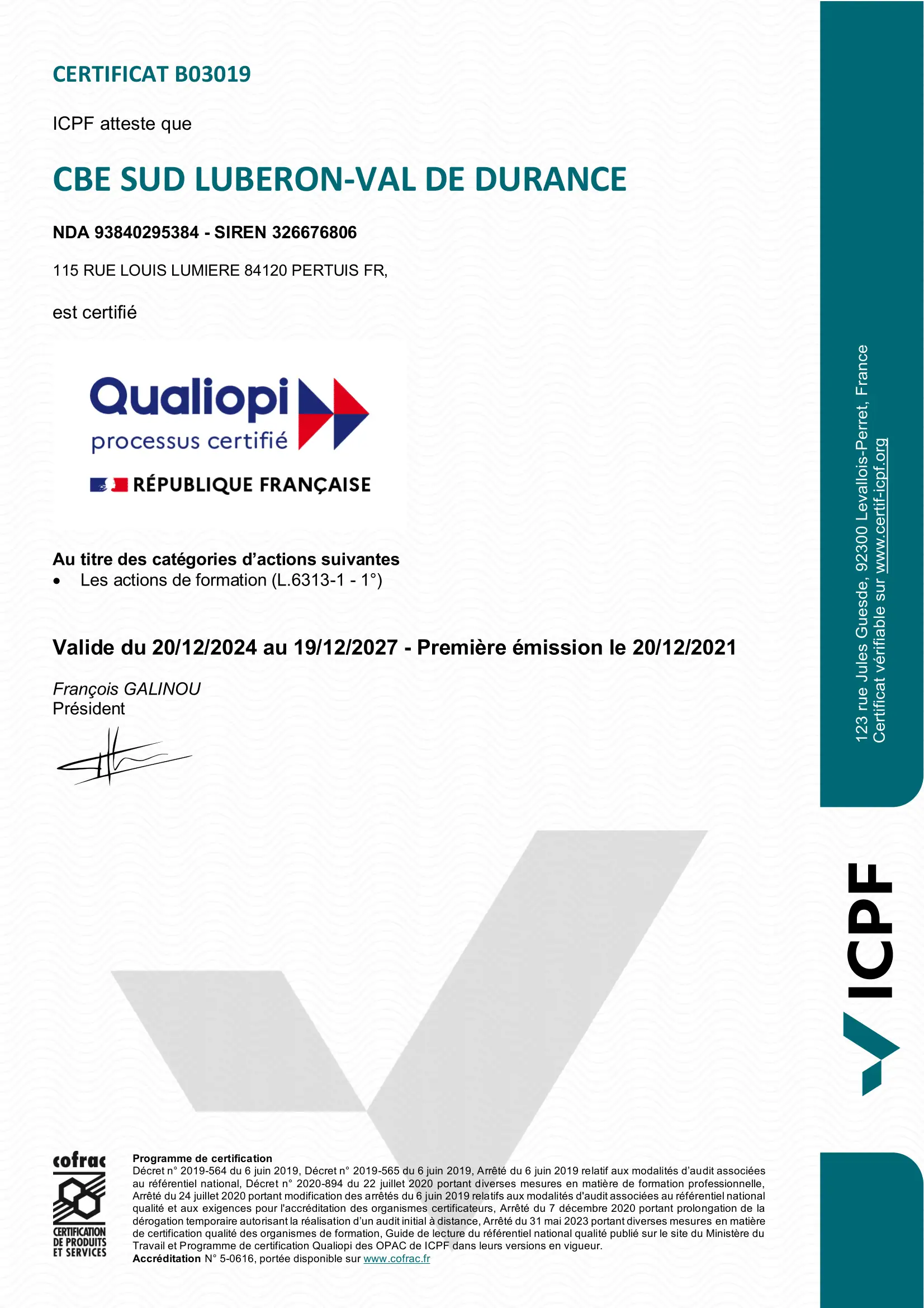 Le CBE Sud Luberon Val de Durance réalise des bilans de compétences en respect du décret n° 2018-1330 du 28 décembre 2018 (articles L.6313-4 et R.6313.-4 du code du travail) relatif aux actions de formation et aux bilans de compétences. Informations légales.